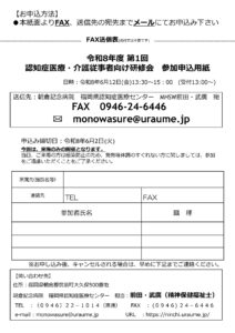 | 備考 | 参加申込用紙にFAX、又は、メール(monowasure@uraume.jp)で 必要事項【①所属先施設名など ②連絡先 ③氏名 ④職種 】を記載の上 お申込み下さい。 参加申込用紙は、下記よりダウンロード可能です。 |
